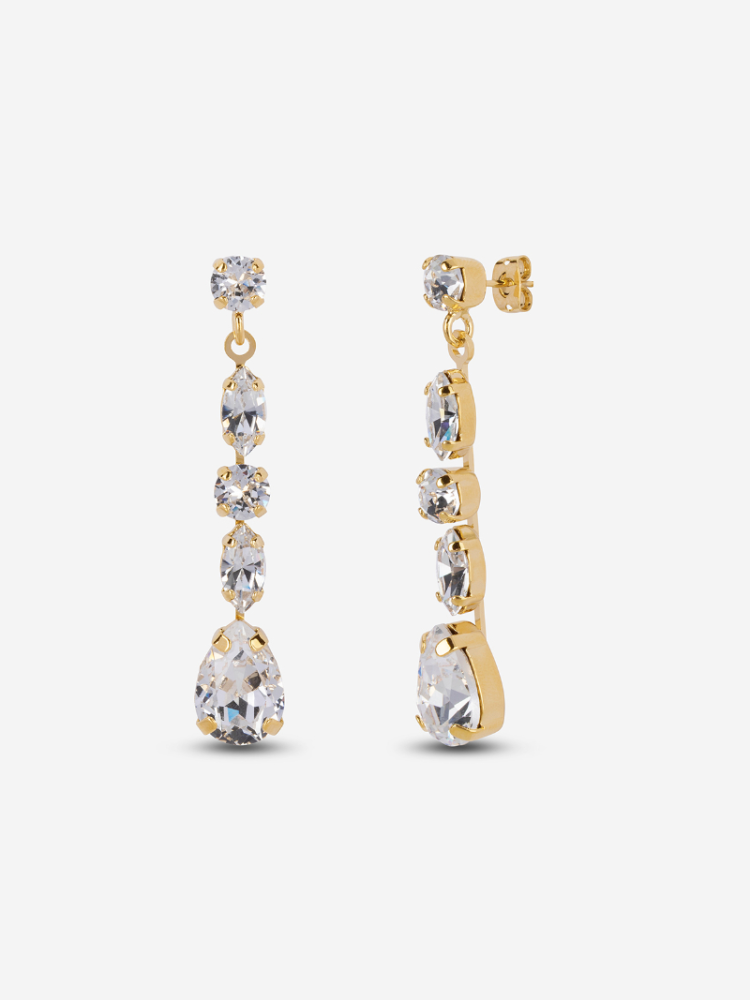 Długie złote kolczyki z kryształami ułożonymi w prostej linii, zakończone większym kamieniem. Wyrazisty i luksusowy design doskonale pasuje do klasycznych sukni ślubnych. Elegancki wybór na wyjątkowe okazje.