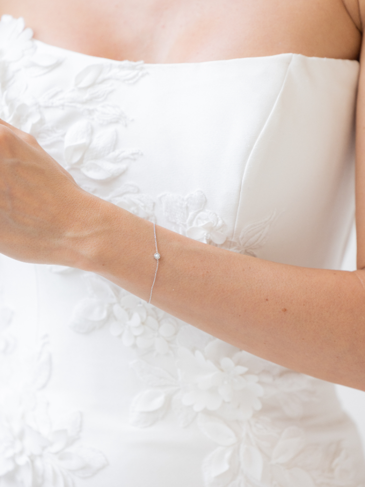 Subtelna srebrna bransoletka z cienkim łańcuszkiem i niewielką perłą w centralnej części. Lekka konstrukcja oraz regulacja długości zapewniają wygodę noszenia. Wykonana ze srebra próby 925 z ochronnym rodowanym wykończeniem. Doskonała do delikatnych, romantycznych stylizacji ślubnych.