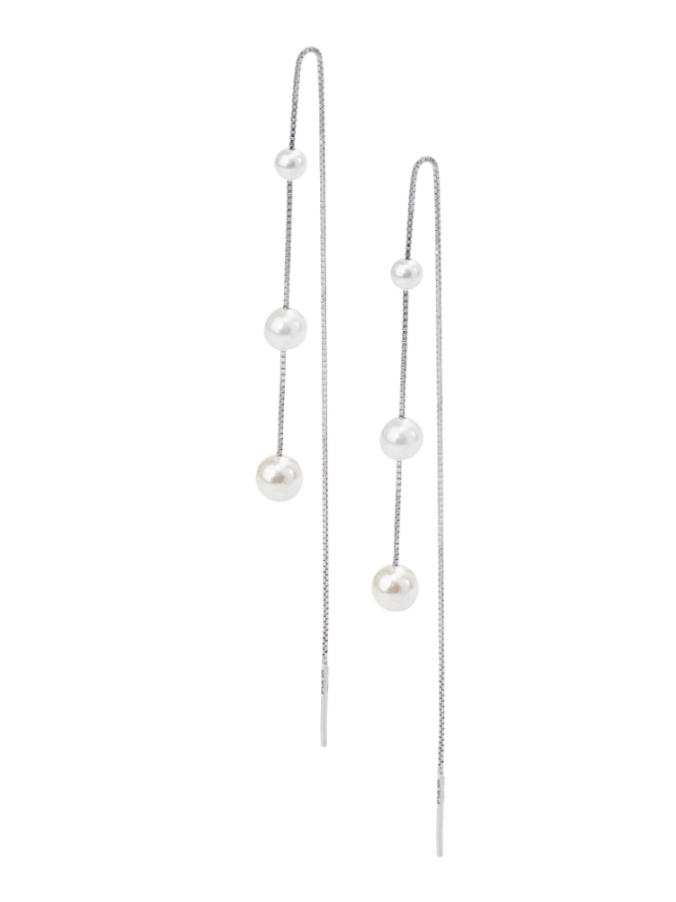 Kolczyki z nitką Maren to nowoczesne kolczyki ślubne z trzema pięknymi perłami na srebrnym łańcuszku próby 925 pokrytym rodem. Konstrukcja nici pozwala na noszenie kolczyków przez wiele kolczyków, tworząc niepowtarzalny wygląd.