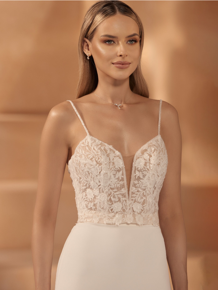 To piękne bolerko jest idealne na dzień ślubu. Top jest wykonany z pięknej koronki i jest bez rękawów. Ma ramiączka i dekolt w kształcie serca. Top można zapiąć na ukryty zamek błyskawiczny. Ten top można idealnie połączyć ze spódnicą Makira.