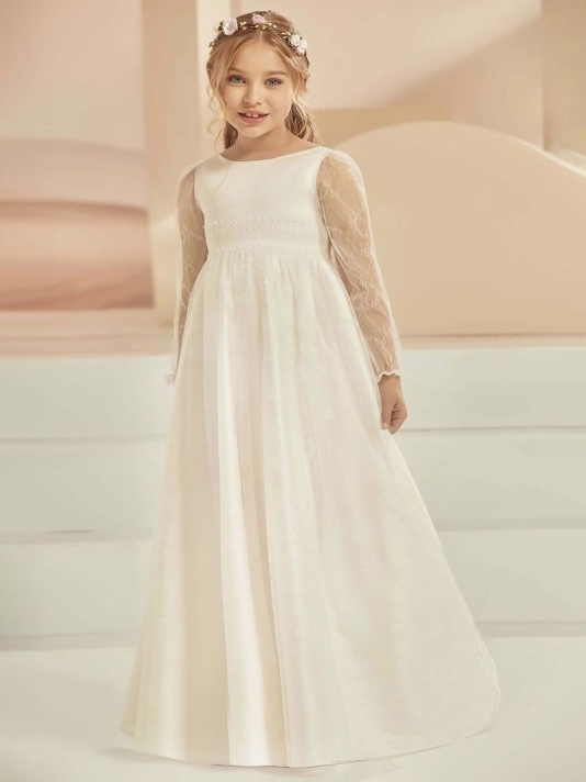 Jest to piękna sukienka komunijna wykonana z koronki z pięknymi detalami. Sukienka ma okrągły dekolt i prześwitujące rękawy.