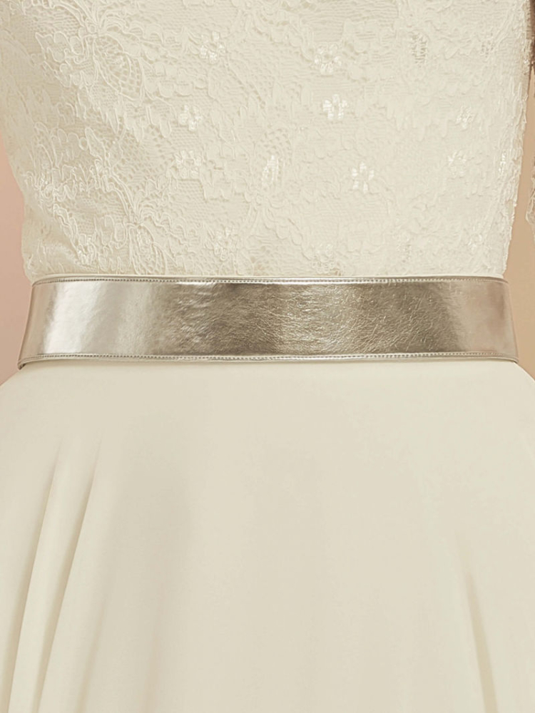 Ten piękny pasek ma metaliczny wygląd i jest lekko błyszczący. Pasek jest ozdobiony zatrzaskami i ma 3,5 cm szerokości. Pasek idealnie pasuje do spódnicy Bianco Evento Ravenna Ivory i swetra ślubnego Bianco Evento E340.