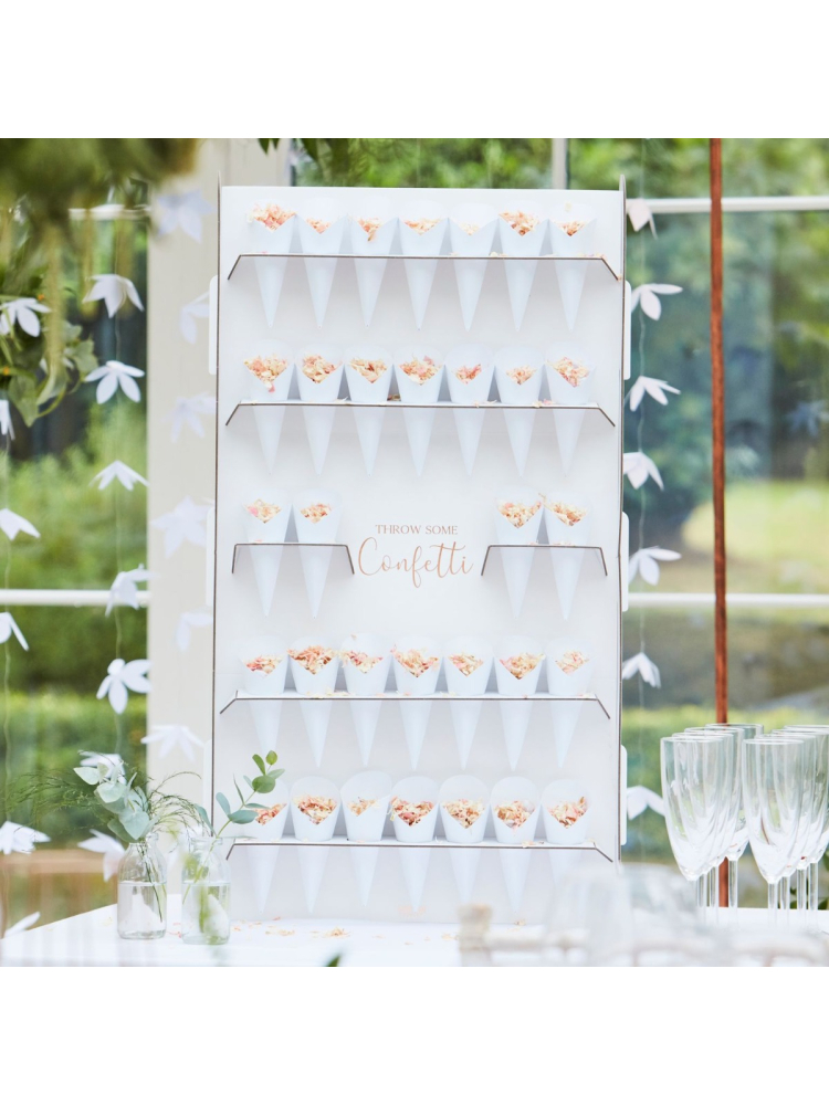 Ścianka jest wykonana z kartonu w kolorze białym i jest dostarczana w celu łatwego montażu. Znak ma tekst Throw Some Confetti w kolorze różowego złota.