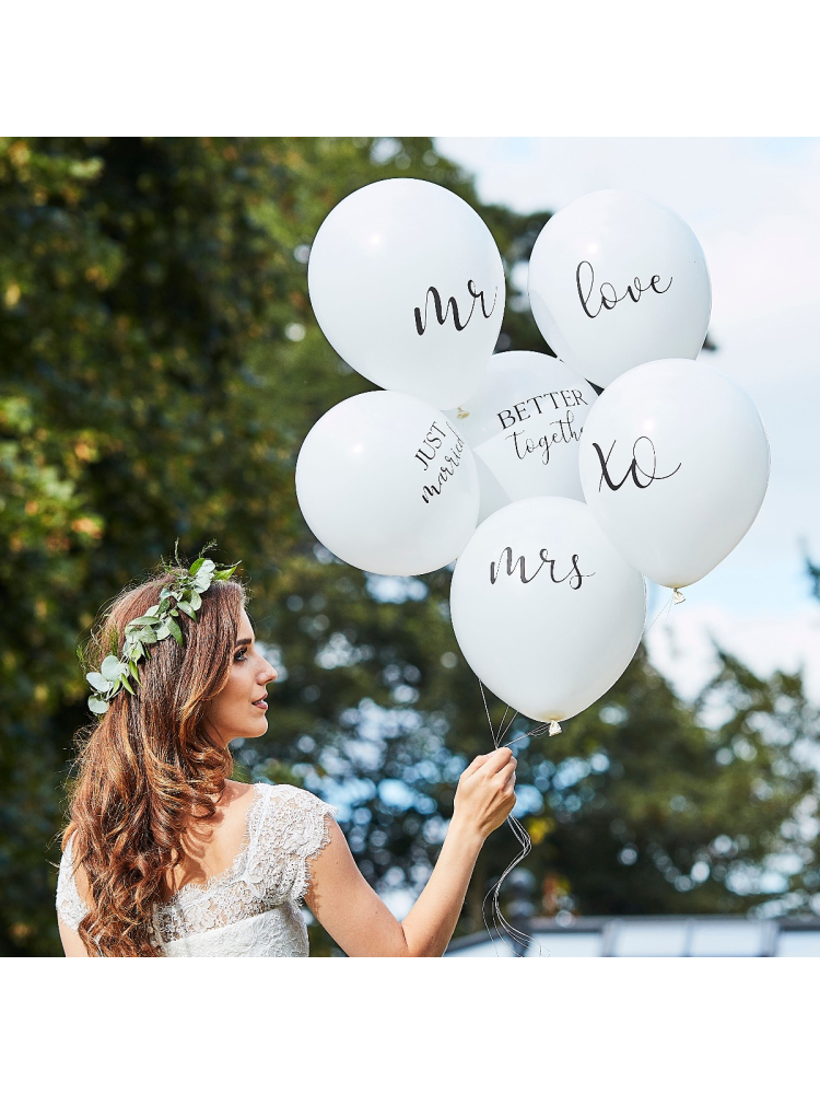 Teksty na białych balonach brzmią: Mr, Mrs, Love, XO, Just married i Better Together. Opakowanie zawiera łącznie 6 balonów, które można napełnić helem lub powietrzem do maksymalnego rozmiaru 30 cm.