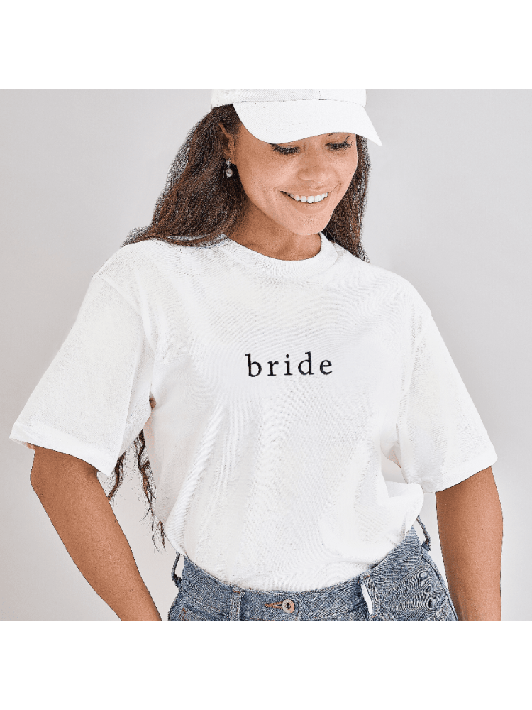 This "Bride" T-shirt is perfect for your bachelorette party. Gather your bride squad with the black 'Team Bride' t-shirts and wear the white "Bride" shirt yourself! The black embroidered text looks great!