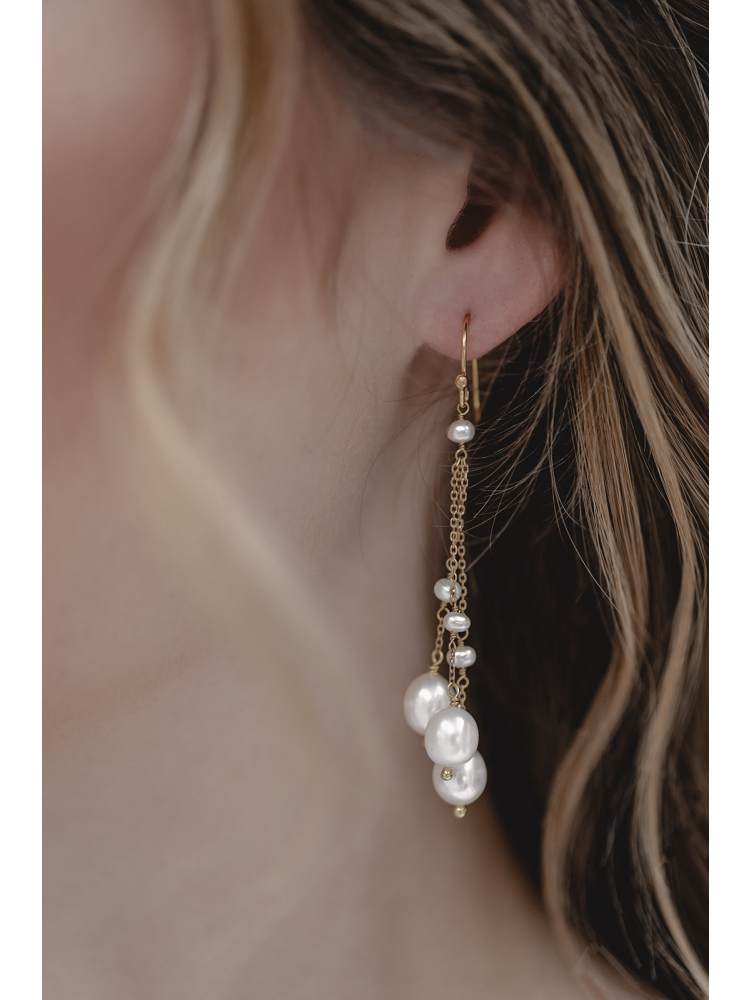 A more whimsical take on the CELESTIAL earrings, these feature three strands, each adorned with both larger and smaller freshwater pearls. Their romantic design is perfect for modern brides seeking to add elegant, feminine touches.