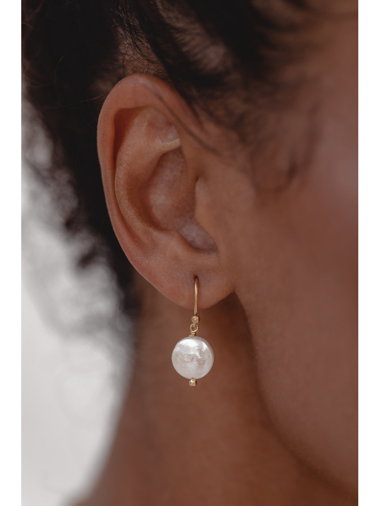 These earrings, featuring pendants made of flat coin-shaped "Coin" pearls, are ideal for brides wishing to blend tradition with modernity. The distinctive shape of these pearls imparts a refreshing elegance, showcasing how innovative and unique pearl earrings can be.