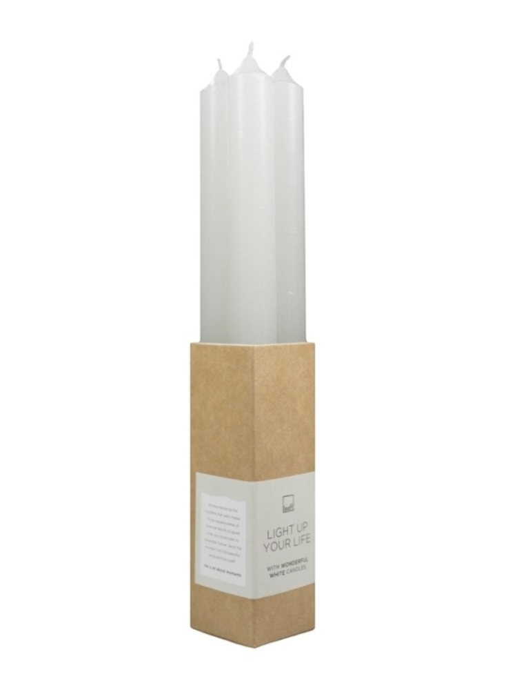 Świece z wosku, każda o wymiarach 25 × 2 cm, palą się około 10 godzin. Przyjeżdżają w prostym, uroczym opakowaniu z napisem 'Light up your life with wonderful white candles' — doskonałe do rustykalnych świeczników i na weselny stół.