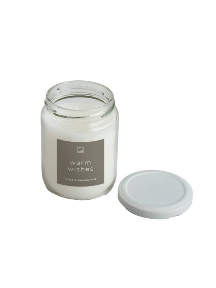 Poznaj Leeff 18617 — świecę w słoiku L „Warm Wishes” White, elegancki dodatek, który emituje miękkie, przytulne światło idealne na chwile ślubne.