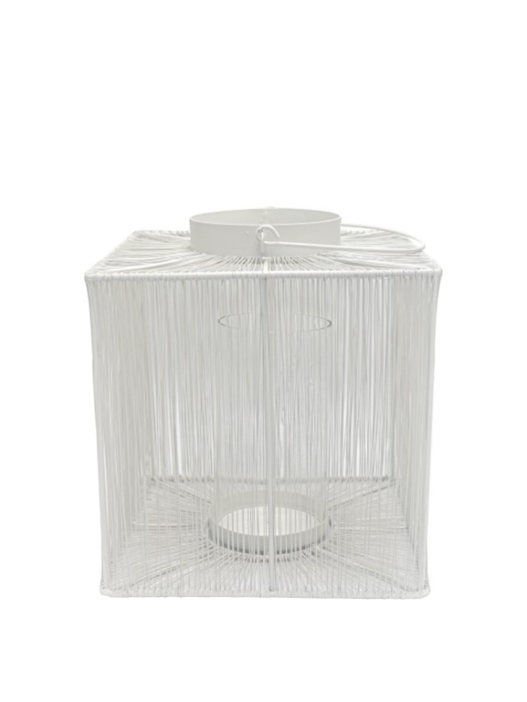 Wykonany z białego metalu i przejrzystych paneli ze szkła, lampion ma wymiary 26 x 26 x 28 cm i nadaje się zarówno do wnętrz, jak i na zewnątrz; wewnątrz mieści świecę lub lampkę LED, dając równomierny, stonowany blask, który delikatnie podkreśla aranżacje stołu i przytulne zakątki.