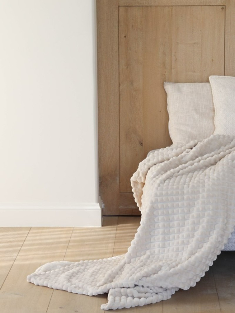 A whisper of shared warmth, this Paula throw in natural fleece invites closeness and quiet comfort for newlyweds and guests.
