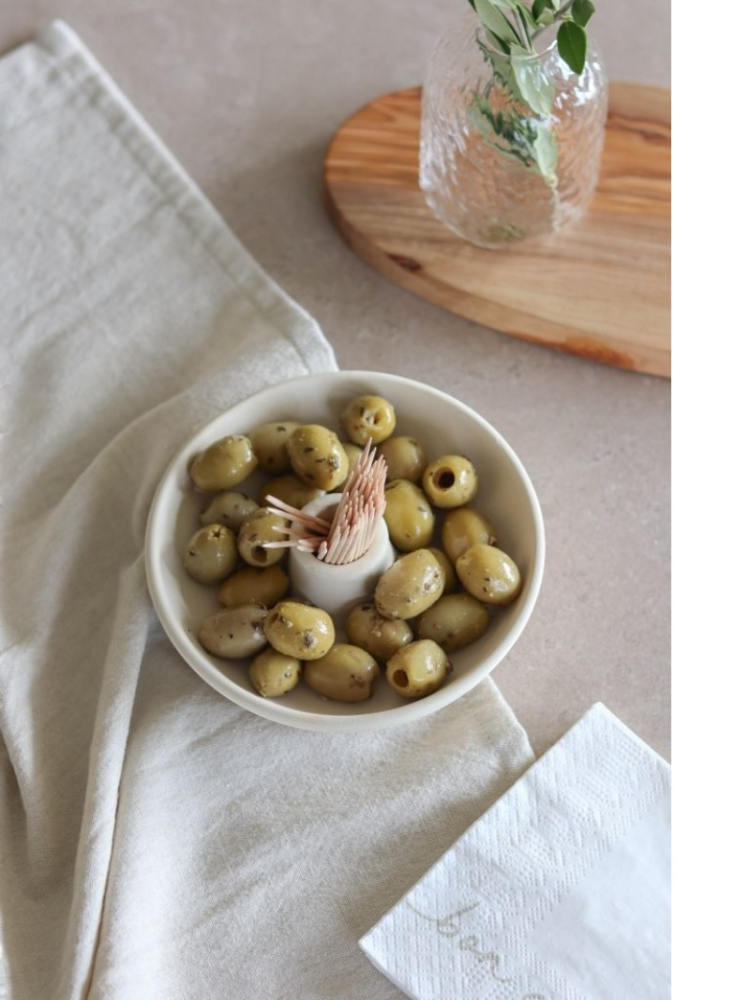 Zaprojektowana, by towarzyszyć rozmowom i uśmiechom, porządkuje stół w subtelny sposób: oliwki w centrum, wykałaczki zawsze na miejscu. Delikatny charakter naczynia dodaje spotkaniom śródziemnomorskiego nastroju i podkreśla piękno prostych przyjemności.