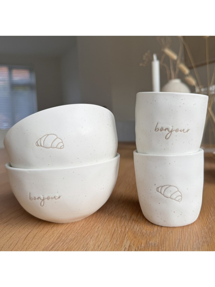 Motyw croissanta i francuskie powitanie delikatnie wprowadzają atmosferę paryskiego śniadania. W duecie kubki prezentują się stylowo i dodają uroku porannemu nakryciu.