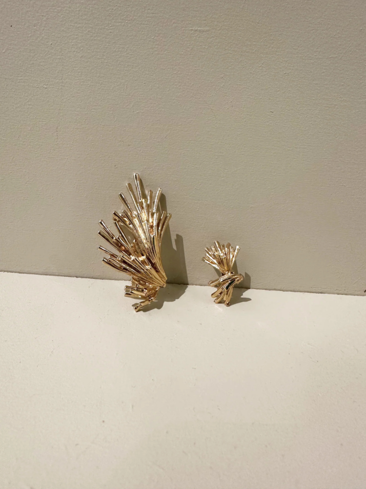 Kolczyki zostały wykonane tak, aby dopasowywać się do naturalnego kształtu ucha, a subtelne zapięcie u góry zapewnia komfort i stabilność. Każdy egzemplarz jest ręcznie wykonany i pokryty cienką warstwą złota, co nadaje mu delikatny, lśniący wygląd. Srebrne sztyfty pomagają zapobiegać reakcjom alergicznym, dzięki czemu kolczyki można nosić wygodnie przez cały dzień.