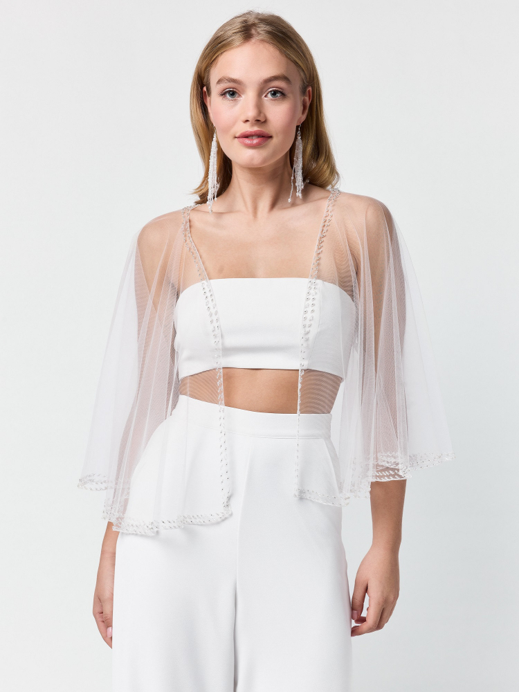Płaszczyk Poirier C-75103 w kolorze kości słoniowej z tiulu charakteryzuje się błyszczącymi, perełkowymi brzegami oraz miękkimi, drapowanymi rękawami. Elegancki, lekki i wykwintny — idealny, by dodać urokliwej finezji Twojemu ślubnemu wyglądowi.