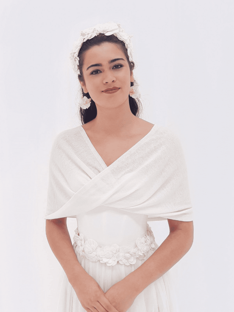 Wybierz model S187 w kolorze kości słoniowej z kolekcji Romantic marki Poirier. Ta stuła jest pleciona na środku z przodu. Stuła jest wykonana z tkaniny mieszanej (16% wełny, 20% akrylu, 20% nylonu i 44% poliestru). Stuła jest w neutralnym kolorze kości słoniowej, dzięki czemu można ją łączyć z różnymi sukniami ślubnymi. Ta piękna stuła jest idealnym wykończeniem stroju ślubnego. Rozmiar tej stuły to "jeden rozmiar dla wszystkich".