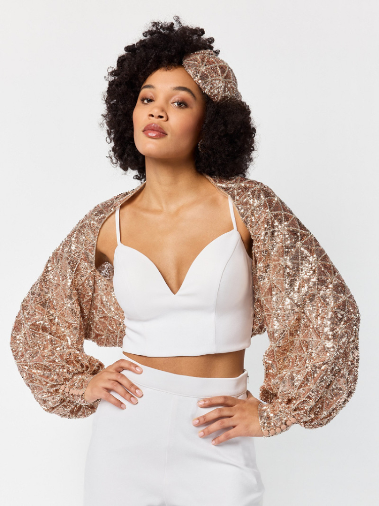 Details: Long sleeves, embellished with sequins and beads in a triangle pattern
