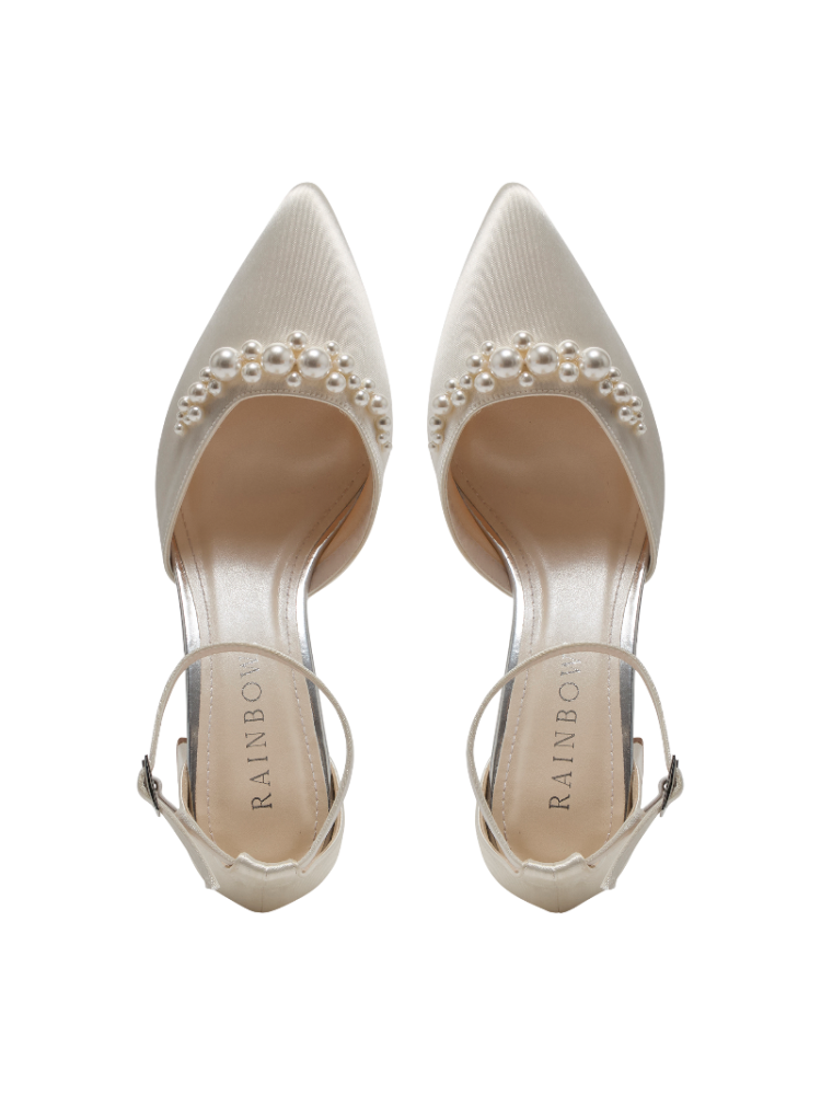 Aurelia to ponadczasowe buty ślubne z nutką nowoczesnego blasku. Te eleganckie buty ślubne z paskiem wokół kostki, wykonane z satyny w kolorze kości słoniowej, mają spiczasty nosek, zamknięty tył, delikatną srebrną klamrę i klasyczny obcas. Wyjątkowym detalem jest efektowna grupa pereł zebranych na czubku buta, która nadaje mu zarówno nowoczesny, jak i romantyczny charakter. Idealne dla narzeczonych, które kochają eleganckie buty z wyjątkowym akcentem.