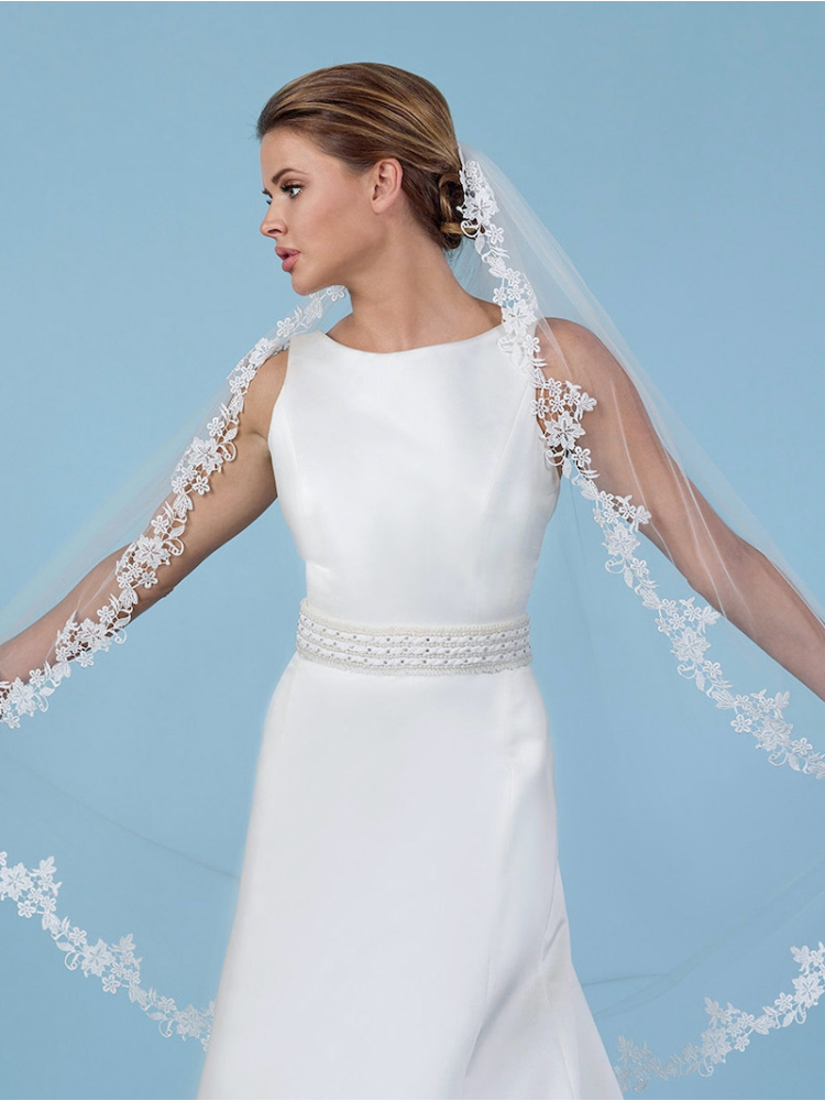 Miękki tiulowy welon z szydełkowaną kwiatową koronką.